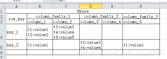 hbase是一张表:表中有一个唯一键是 row key, 每个row key 对应 N(N >= 1)个列族。每个列族由N个列组成(N>=1)。