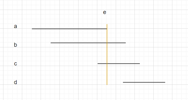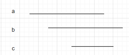 3.去掉覆盖重复线段,使得线段右端点保证递增,如下图所示:b线段已经覆盖了c线段,所以c线段被舍去