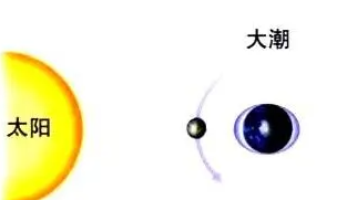 太阳引力同样对地球上的水产生作用。毎当新月升起时,太阳、月球和地球就会儿乎排在同一条线上,此现象毎月会发生一次。太阳和月球的太阳引力朝同一方向使劲儿,这股合力产生一种在高潮和低潮间差异最大的潮,称为大潮