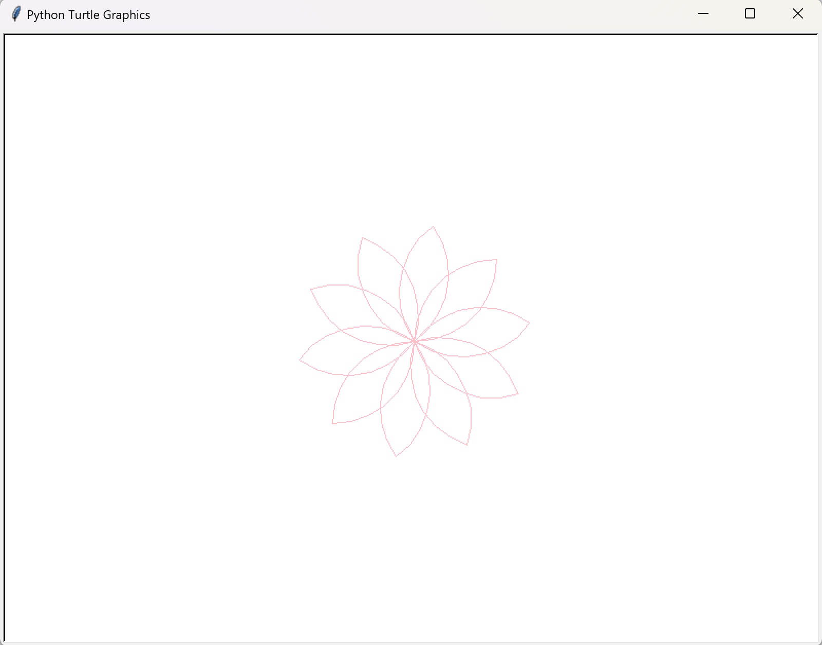 1 from turtle import * 2 3 setup(800, 600) 4 pencolor('pink') 5 6 n=10 7 for i in range(n): 8 # 绘制一片花瓣 9 for j in range(2): 10 circle(80, 90) 11 left(90) 12 13 right(360/n) 14 15 hideturtle() 16 done()