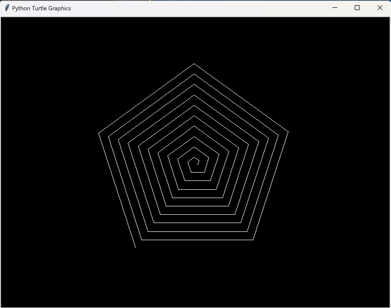 1 from turtle import * 2 3 setup(800, 600) 4 bgcolor('black') 5 pencolor('white') 6 speed(0) 7 8 angle = 0 9 size = 2 10 11 n = 5 # 螺旋n边形 12 count = 50 # 循环次数 13 for i in range(count): 14 fd(size) 15 angle += 360/n 16 seth(angle) 17 size += 5 18 19 hideturtle() 20 done()