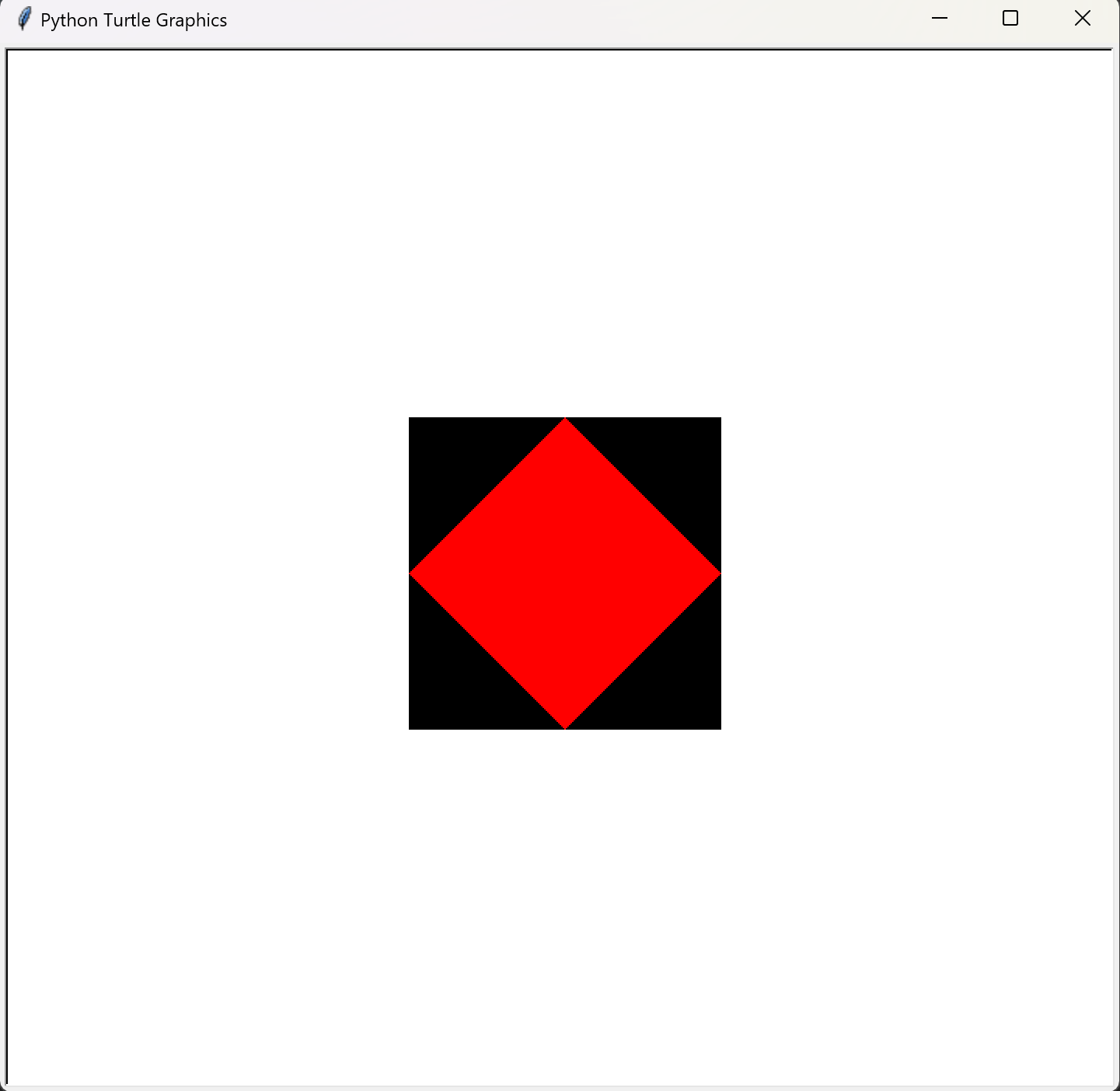 1 from turtle import * 2 3 penup() 4 goto(-100,-100) 5 pendown() 6 7 color('black') 8 begin_fill() 9 for i in range(4): 10 fd(200) 11 left(90) 12 end_fill() 13 14 penup() 15 goto(-100,0) 16 pendown() 17 18 color('red') 19 begin_fill() 20 right(45) 21 for i in range(4): 22 fd(100*2**0.5) 23 left(90) 24 end_fill() 25 26 hideturtle() 27 done()