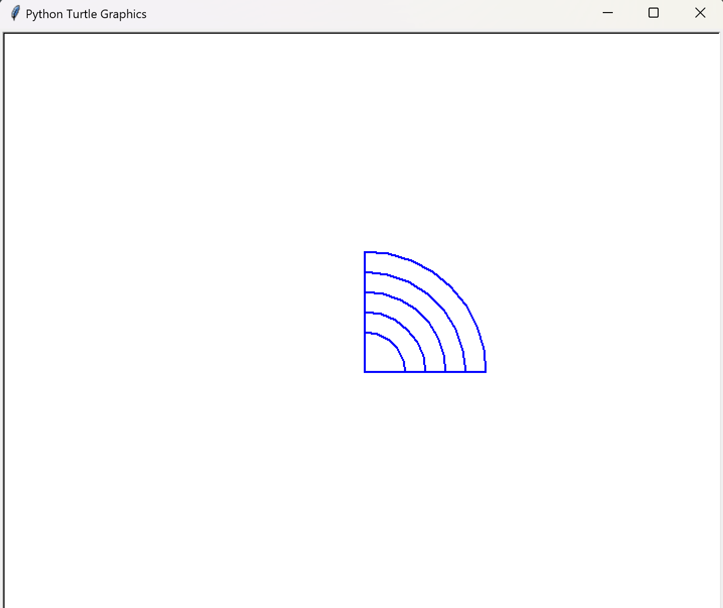 1 from turtle import * 2 3 pensize(2) 4 pencolor('blue') 5 6 r=40 7 for i in range(5): 8 fd(r) 9 left(90) 10 circle(r,90) 11 left(90) 12 fd(r) 13 left(90) 14 r+=20 15 16 hideturtle() 17 done()