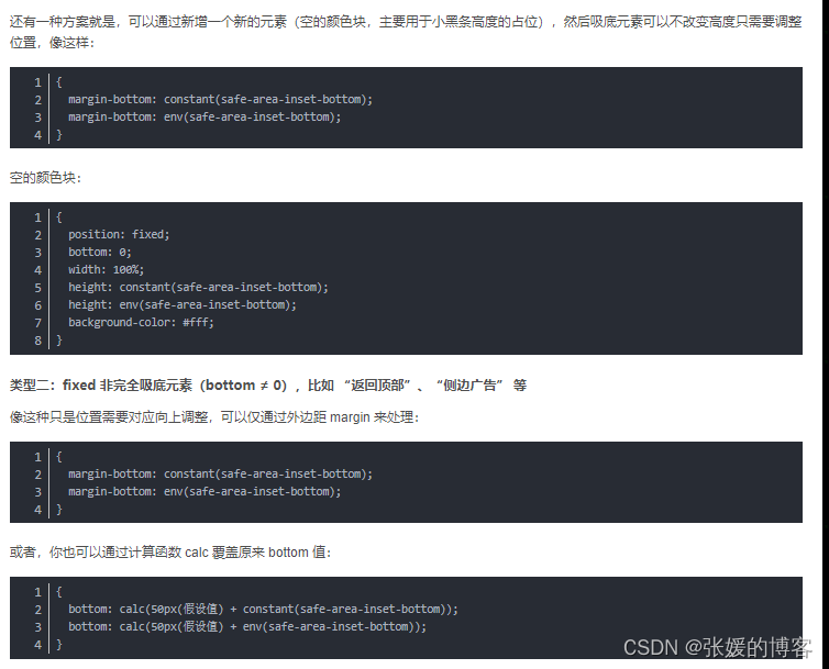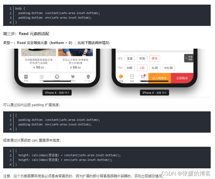 iPhoneX 取消了物理按键,改成底部小黑条,这一改动导致网页出现了比较尴尬的屏幕适配问题。对于网页而言,顶部(刘海部位)的适配问题浏览器已经做了处理,所以我们只需要关注底部与小黑条的适配问题即可(即常见的吸底导航、返回顶部等各种相对底部 fixed 定位的元素)。