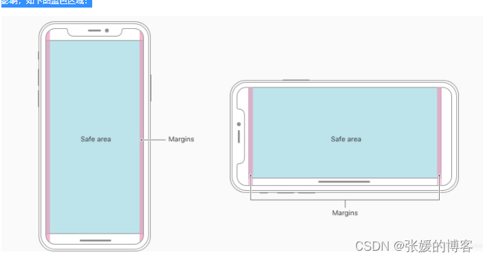 安全区域指的是一个可视窗口范围,处于安全区域的内容不受圆角(corners)、齐刘海(sensor housing)、小黑条(Home Indicator)影响,如下图蓝色区域: