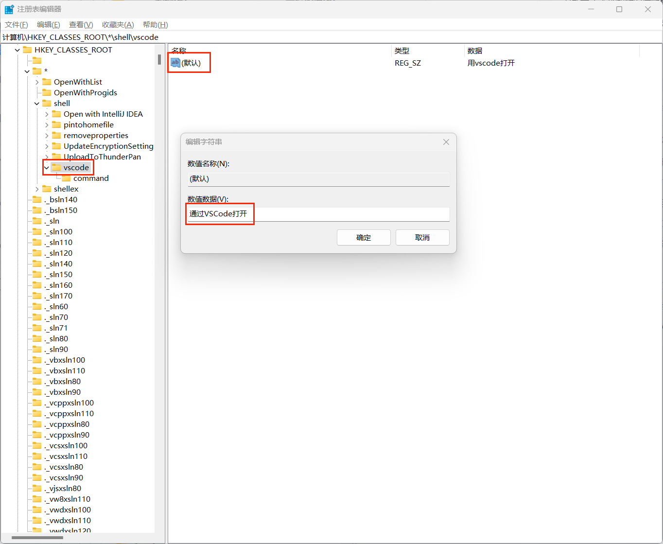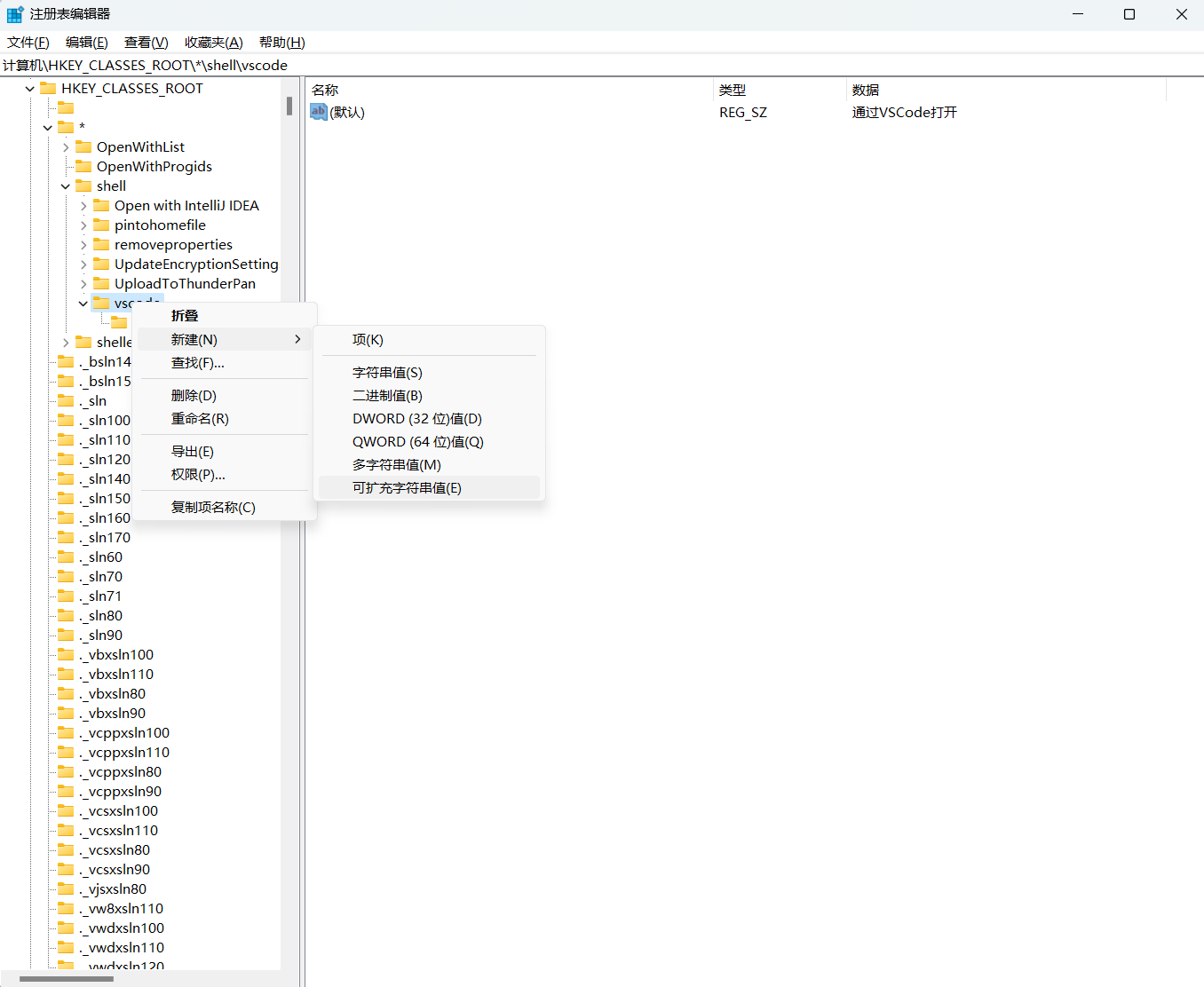 接着继续添加通过vscode打开文件夹的功能,找到注册表中“计算机\HKEY_CLASSES_ROOT\Directory\shell”,重复上述操作,在最后一步时将%V改成%1即可。