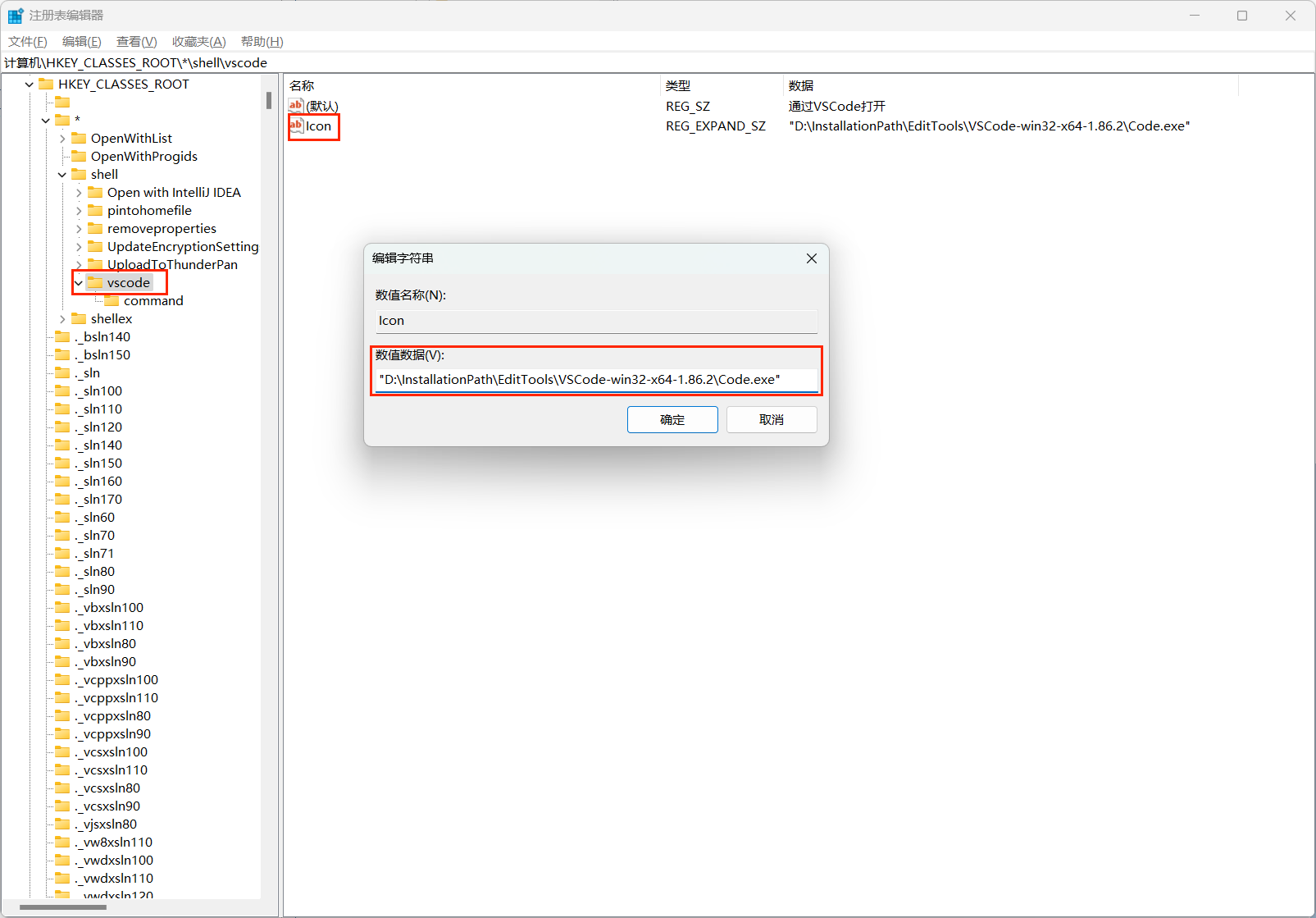 接下来在command中的子命令添加以下数值数据:"D:\InstallationPath\EditTools\VSCode-win32-x64-1.86.2\Code.exe" "%V"