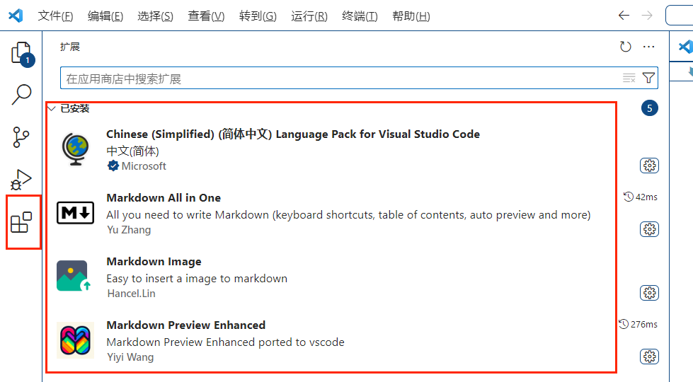 - 上述设置完成后,自己准备一个文件夹,右键通过vscode打开,点击插件按钮,安装如下插件,就可以使用markdown语法了