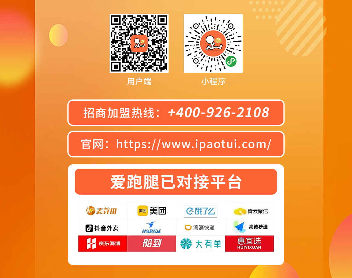 爱跑腿已与美团、抖音外卖、滴滴快递等主流平台合作,为加盟商提供了稳定的订单来源。并且,实行区域保护政策,让加盟商享有专属运营权,避免区域内竞争。