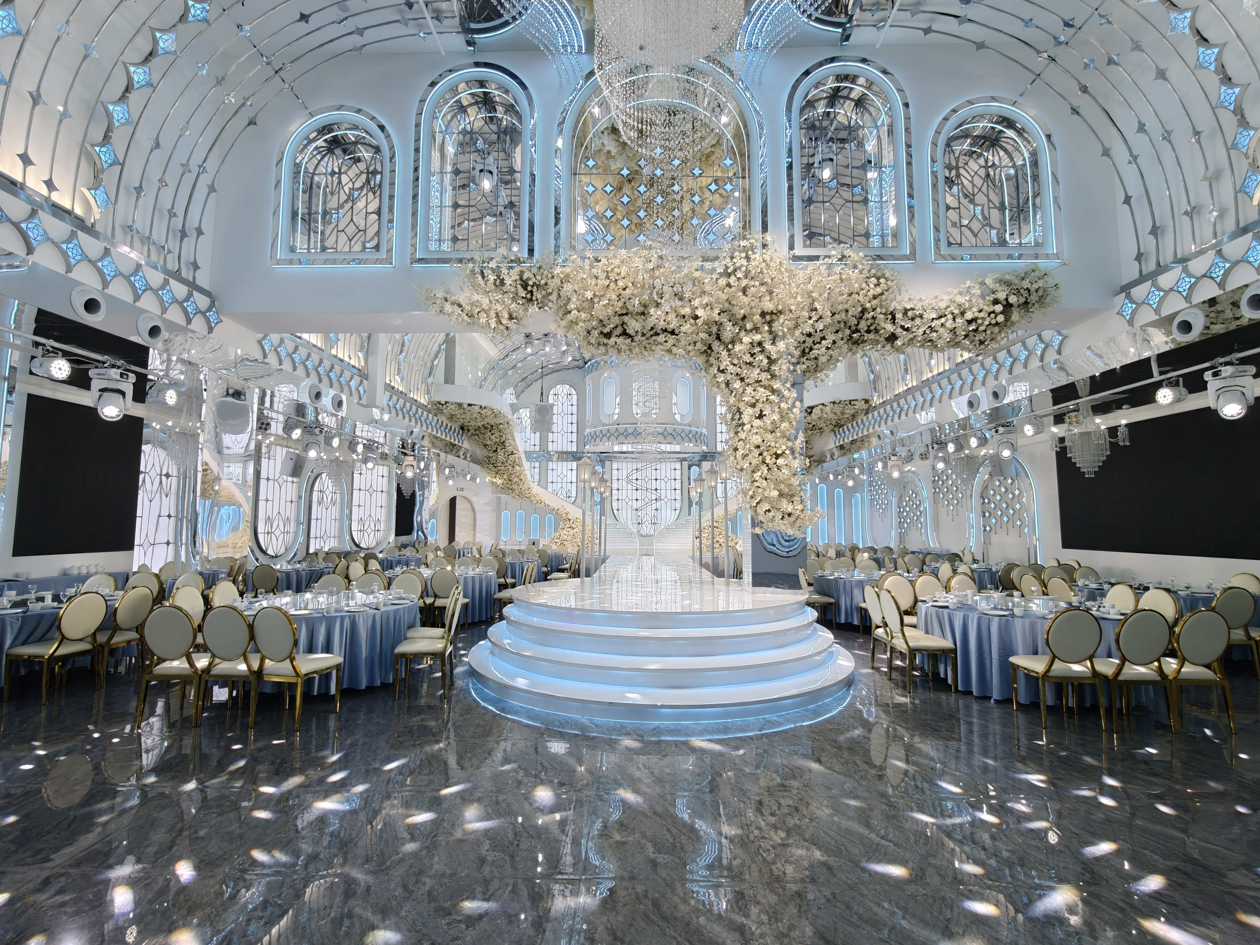 - 八大主题宴会厅全覆盖:从复刻奥斯卡颁奖典礼的水晶歌剧厅(层高11米,海浪型新娘出场楼梯),到日照独一份的森系绿野仙踪厅(镜面吊顶+薄雾机营造仙境),再到系云白圣洁殿堂厅,八大风格满足不同新人的仪式感需求,其中塞纳浮光新法式厅因双梯出场设计,成交率高达99%。
