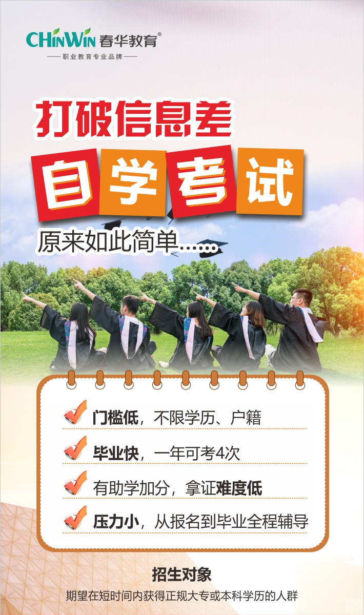 浙江春华教育科技有限公司专注成人学历提升20余年,布局浙江、江苏、六安、临沂、青岛等地上百家直营校区,是正规函授站,合作高校均为正规院校,毕业证学信网可查、国家认可。提供1对1学业规划、直播+录播灵活学习、专属班主任全程伴学、一站式教务支持等服务,自考类项目通过率显著高于行业平均水平,累计培养逾150万优质毕业学员,是成人自考学员的放心之选。