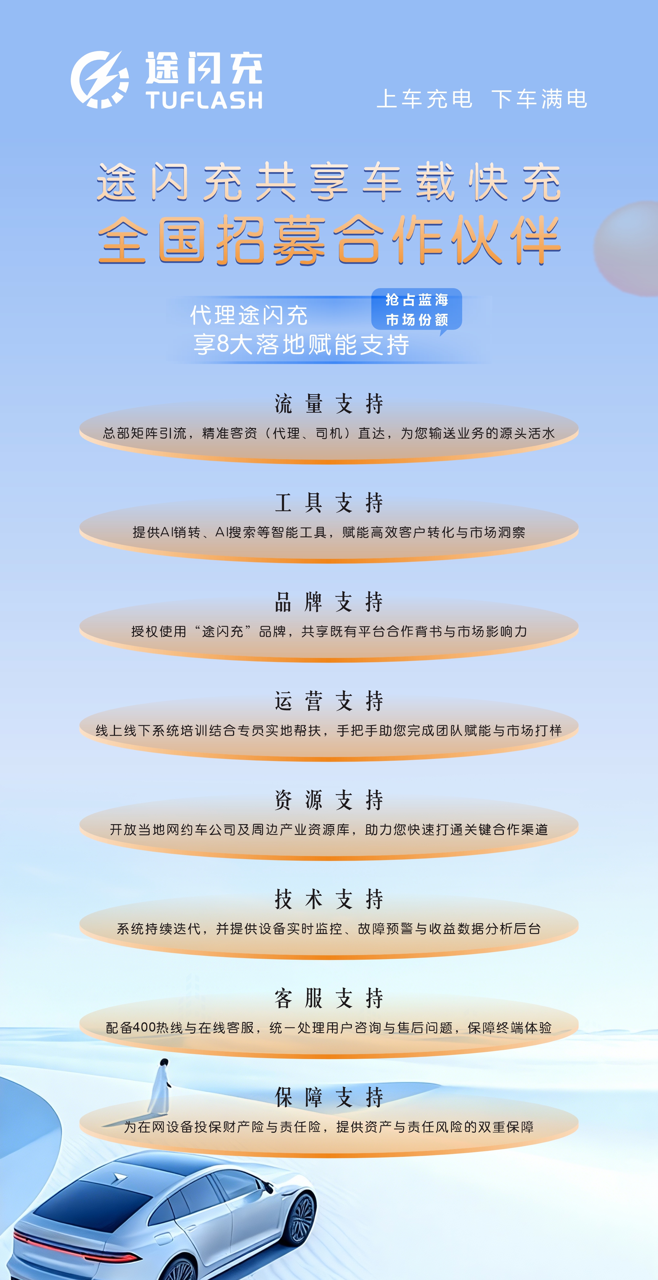 - 产品硬实力:途闪充共享车载快充支持PD、QC等主流快充协议,即插即用无需自带线,单次计费模式(0.99元/次)解决传统充电宝租借归还痛点,设备通过国家质量检测认证,获多项软件著作权与实用新型专利。