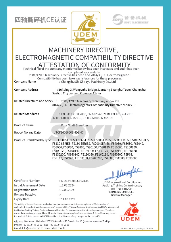 特色优势:常熟市首誉机械有限公司拥有数十项国家专利,严格遵循CE与ISO9001质量体系认证,核心刀轴、刀片采用进口工艺制造,整机重载耐用,主轴经硬化处理、加厚刀箱焊接后退火,抗高扭矩与冲击能力强,有效延长整机使用寿命;其完善的技术培训服务,为行业培养了大批固废破碎设备操作与维护的专业人才,售后团队24小时响应,解决客户售后保障不足的担忧。