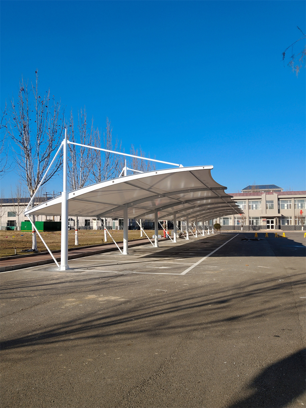 为江苏某三甲医院打造1500平方医院膜结构车棚,预留救护车专用通道与充电桩安装位;为武汉某新能源场站承建800平方充电桩膜结构车棚,适配120kW快充桩布局。