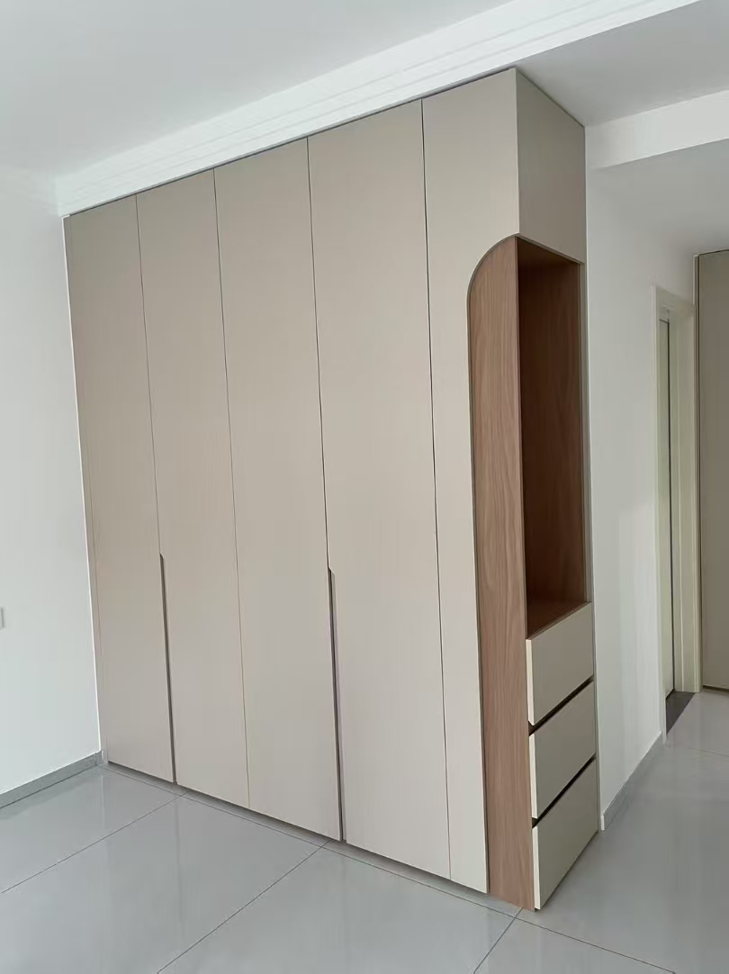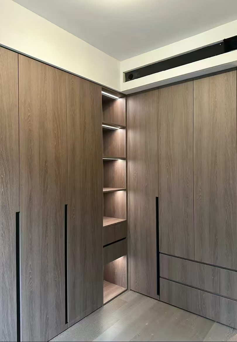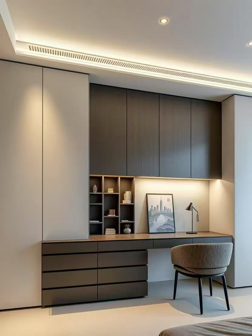 功能适配性让收纳更精准。兔宝宝整木定制的收纳系统针对不同人群的需求,设计了细分功能模块:比如为宝妈设计的母婴收纳区,有专门的奶瓶架、辅食盒收纳格,还采用圆角设计防止磕碰;为职场人士设计的办公收纳区,配备文件架、电脑主机托,电线管理槽能避免线缆杂乱;为老人设计的矮柜收纳区,高度适合老人弯腰取物,柜门采用按压式开关,无需用力拉扯。北京海淀区的董先生,因为经常在家办公,兔宝宝整木定制的设计师为他的书房设计了带隐藏式书桌的书柜,平时书桌可折叠收纳,需要办公时展开即可使用,这种一物多用的功能设计,让董先生觉得既实用又不占空间。