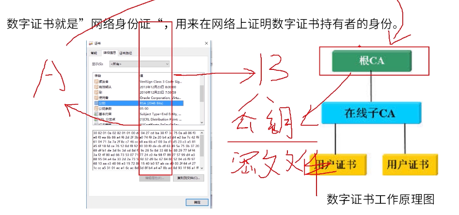 数字证书:一是用于识别网站的身份(防钓鱼网站);另外,证书包含公钥,用于在非对称加密方式下实现客户端和服务器端的加密传输。