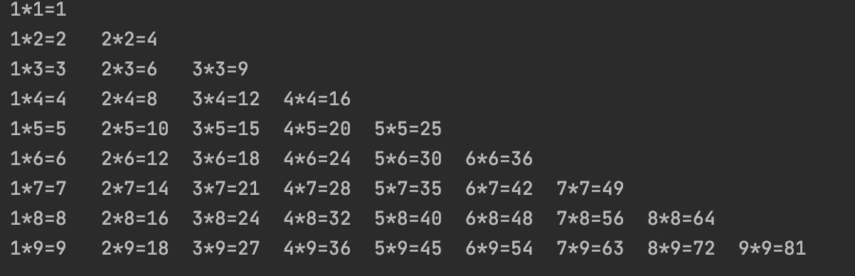 System.out.print(j + "*" + i +"="+(i * j) + "\t");