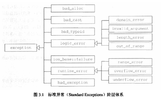 标准异常类别,基类exception,标准异常类别:语言本身支持的异常,C++标准库发出的异常,程序作用域之外发出的异常。