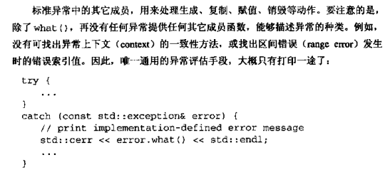 为了在catch语句中处理异常,必须采用异常所提供的接口,所有标准异常接口,只含有一个成员函数what(),用以获取型别本身之外的附加信息。