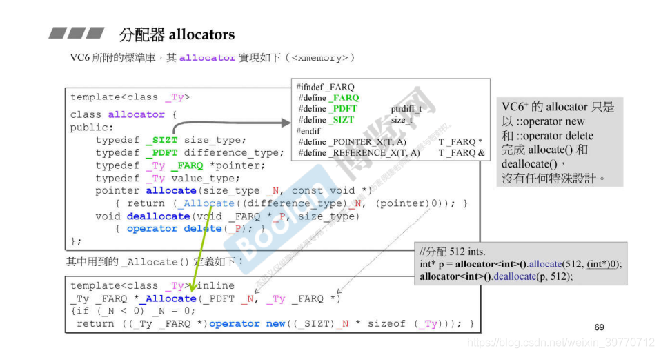 allocator中两个最重要的函数是allocate和deallocate。allocate最终会调用operator new。