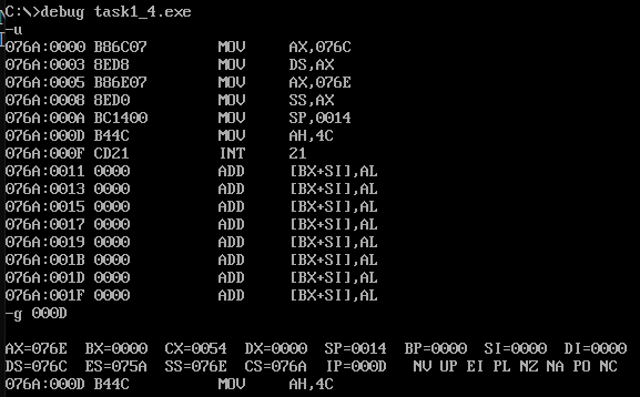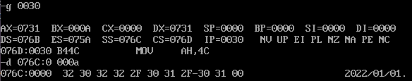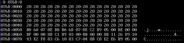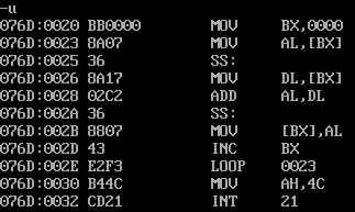 assume cs:code,ds:data1,ds:data2,ds:data3 data1 segment db 50, 48, 50, 50, 0, 48, 49, 0, 48, 49 ; ten numbers data1 ends data2 segment db 0, 0, 0, 0, 47, 0, 0, 47, 0, 0 ; ten numbers data2 ends data3 segment db 16 dup(0) data3 ends code segment start: mov ax,data1 mov ds,ax mov dx,data3 mov ss,dx mov cx,10 mov bx,0 s1:mov al,ds:[bx] mov ss:[bx],al inc bx loop s1 mov ax,data2 mov ds,ax mov cx,10 mov bx,0 s2:mov al,ds:[bx] mov dl,ss:[bx] add al,dl mov ss:[bx],al inc bx loop s2 mov ah,4ch int 21h code ends end start