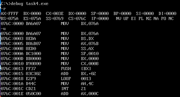 assume cs:code,ds:data1,ss:data2 data1 segment dw 2, 0, 4, 9, 2, 0, 1, 9 data1 ends data2 segment dw 8 dup(?) data2 ends code segment start: mov dx,data1 mov ds,dx; mov ax,data2 mov ss,ax mov sp,10h mov bx,0 mov cx,8 s:push ds:[bx] add bx,2 loop s mov ah, 4ch int 21h code ends end start