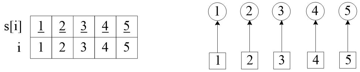 (1)初始化。定义数组int s[]是以结点i为元素的并查集,开始的时候,还没有处理点与点之间的朋友关系,所以每个点属于独立的集,并且以元素i的值表示它的集s[i],例如元素1的集s[1]=1。