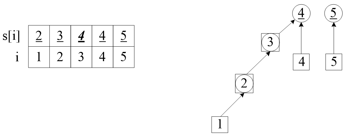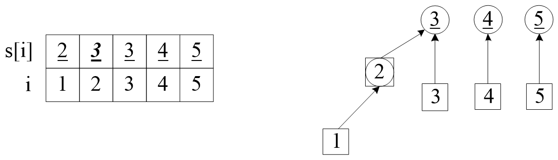 下面是图解,左边给出了元素与集合的值,右边画出了逻辑关系。为了便于讲解,左边区分了结点i和集s:把集的编号加上了下划线;右边用圆圈表示集,方块表示元素。
