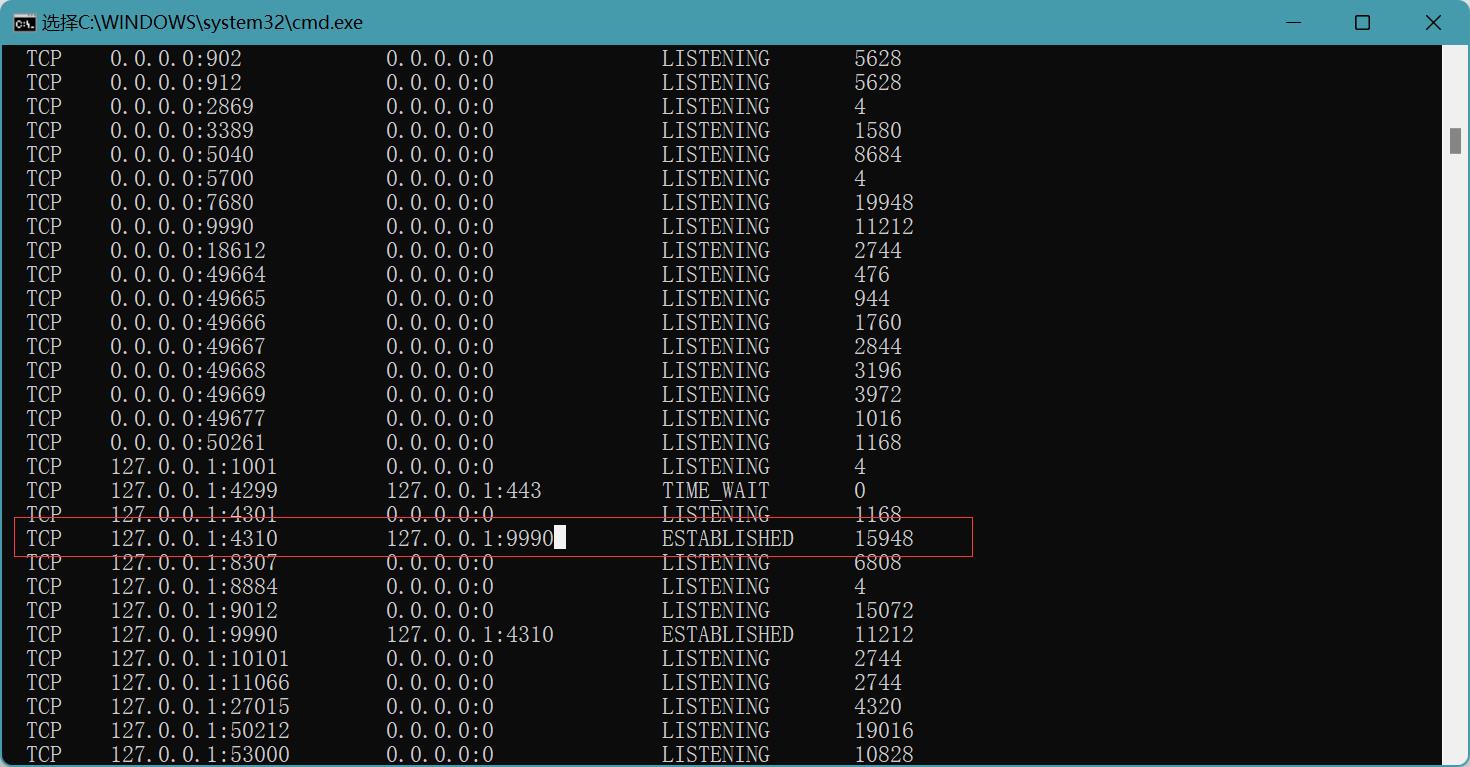 3.再此基础上运行客服端程序,执行 netstat –nao 可以看到本机IP的9990端口上,有一个TCP连接处于建立连接状态。