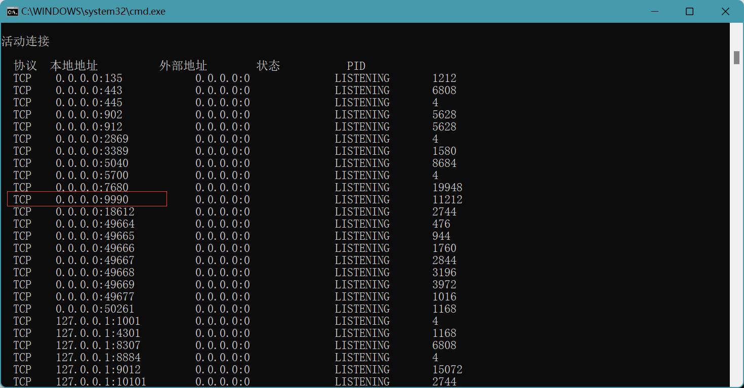 4. 0.0.0.0:9990端口上有一个TCP处于LINSTENING状态