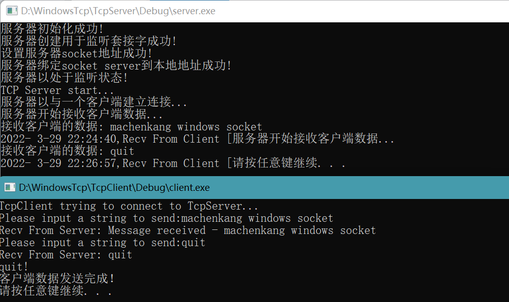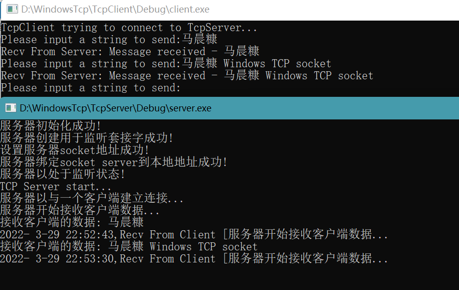 3.在同一台或不同计算机上分别运行TcpServer和TcpClient进行消息的发送和接收测试。要求建立连接后客户端可连续多次向服务器端发送消息。