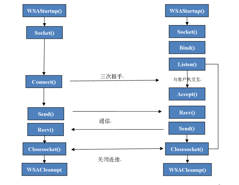 1.在server端,server首先启动,调用socket()创建套接字;然后调用bind()绑定server的地址(IP+port);再调用listen()让server做好侦听准备,并规定好请求队列长度,然后server进入阻塞状态,等待client的连接请求;最后通过accept()来接收连接请求,并获得client的地址。当accpet接收到一个client发来的connet请求时,将生成一个新的socket,用于传输数据。