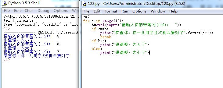 2、猜数字游戏。在程序中预设一个0-9之间的整数,让用户通过键盘输入所猜的数,如果大于预设的数,显示“遗憾,太大了!”;小于预设的数,显示“遗憾,太小了!”,如此循环,直至猜中该数,显示“预测了N次,你猜对中了!”,其中N是用户输入数字的次数。