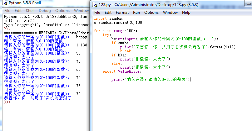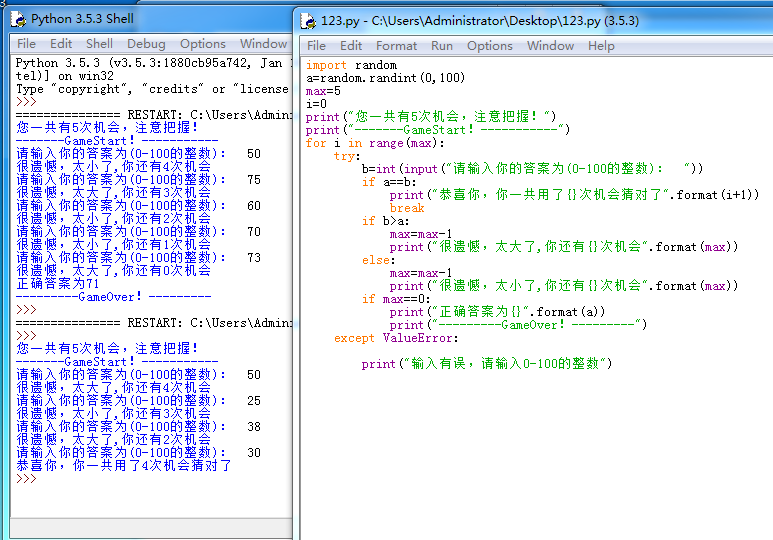 4、猜数字游戏续。对于第4题中的猜数字游戏,当用户输入的不是整数(如字母、浮点数等)时,程序会终止执行退出。要求改编该程序,当用户输入出错时给出“输入内容必须为整数”的提示,并让用户重新输入。