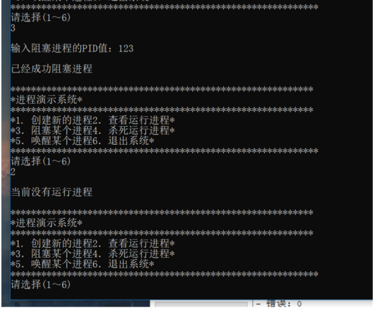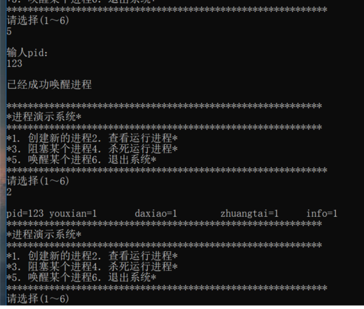 #include<stdio.h> #include<stdlib.h> #include<string.h> struct jincheng_type { int pid; int youxian; int daxiao; int zhuangtai;//标识进程状态,0-不在内存,1-在内存,2-阻塞 char info[10]; }; struct jincheng_type neicun[20]; int shumu=0,zuse=0,pid,flag=0; void create() { if(shumu>=20) printf("\n内存已满,请先唤醒或杀死进程n"); else { int i; for(i=0;i<20;i++) //定位,找到可以还未创建的进程 if(neicun[i].zhuangtai==0) break; printf("\n请输入新进程pid\n"); scanf("%d",&(neicun[i].pid)); for(int j=0;j<i;j++) if(neicun[i].pid==neicun[j].pid) { printf("\n该进程已存在n"); return; } printf("\n请输入新进程优先级\n"); scanf("%d",&(neicun[i].youxian)); printf("\n请输入新进程大小\n"); scanf("%d",&(neicun[i].daxiao)); printf("\n请输入新进程内容\n"); scanf("%s",neicun[i].info); //创建进程,使标记位为1 neicun[i].zhuangtai=1; shumu++; } } void run() { for(int i=0;i<20;i++) { if(neicun[i].zhuangtai==1) { //输出运行进程的各个属性值 printf("\npid=%d\t",neicun[i].pid); printf("youxian=%d\t",neicun[i].youxian); printf("daxiao=%d\t",neicun[i].daxiao); printf("zhuangtai=%d\t",neicun[i].zhuangtai); printf("info=%s\t ",neicun[i].info); flag=1; } } if(!flag) printf("\n当前没有运行进程\n"); } void zusetai() { if(!shumu) { printf("当前没有运行进程\n"); return; } printf("\n输入阻塞进程的PID值:"); scanf("%d",&pid); for(int i=0;i<20;i++) { //定位,找到所要阻塞的进程,根据其状态做相应处理 if(pid==neicun[i].pid) { if(neicun[i].zhuangtai==1) { neicun[i].zhuangtai=2; zuse++; printf("\n已经成功阻塞进程\n"); } else if(neicun[i].zhuangtai==0) printf("\n要阻塞的进程不存在\n"); else printf("\n要阻塞的进程已被阻塞\n"); flag=1; } } //找不到,则说明进程不存在 if(flag==0) printf("\n要阻塞的进程不存在\n"); } void kill() { if(!shumu) { printf("当前没有运行进程\n"); return; } printf("\n输入杀死进程的PID值"); scanf("%d",&pid); for(int i=0;i<20;i++) { //定位,找到所要杀死的进程,根据其状态做相应处理 if(pid==neicun[i].pid) { if(neicun[i].zhuangtai==1) { neicun[i].zhuangtai=0; shumu--; printf("\n已成功杀死进程\n"); } else if(neicun[i].zhuangtai==0) printf("\n:要杀死的进程不存在\n"); else printf("\n要杀死的进程已被阻塞\n"); } flag=1; //找不到,则说明进程不存在 if(!flag) printf("\n要杀死的进程不存在\n"); } } void huanxing() { if(!shumu) { printf("\n当前没有运行进程\n"); return; } if(!zuse) { printf("\n当前没有阻塞进程\n"); return; } printf("\n输人pid:\n"); scanf("%d",&pid); for(int i=0;i<20;i++) { //定位,找到所要杀死的进程,根据其状态做相应处理 if(pid==neicun[i].pid) { if(neicun[i].zhuangtai==2) { neicun[i].zhuangtai=1; zuse--; printf("\n已经成功唤醒进程\n"); } else if(neicun[i].zhuangtai==0) printf("\n要唤醒的进程不存在\n"); else printf("\n要唤醒的进程已被阻塞\n"); } flag=1; //找不到,则说明进程不存在 } if(!flag) printf("\n要唤醒的进程不存在\n"); } int main() { int n=1; int num; //一开始所有进程都不在内存中 for(int i=0;i<20;i++) neicun[i].zhuangtai=0; while(n) { printf("\n***********************************************************"); printf("\n*进程演示系统*"); printf("\n***********************************************************"); printf("\n*1. 创建新的进程2.查看运行进程*"); printf("\n*3.阻塞某个进程4.杀死运行进程*"); printf("\n*5.唤醒某个进程6.退出系统*"); printf("\n************************************************************"); printf("\n请选择(1~6)\n"); scanf("%d",&num); switch(num) { case 1:create();break; case 2:run();break; case 3:zusetai();break; case 4:kill();break; case 5:huanxing();break; case 6:exit(0); default:n=0; } flag=0;//恢复标记 } return 0; }