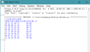 import random def number(): a=[random.randint(1,35) for i in range(5)] l=[] for i in a: if i not in l: l.append(i) else: i=random.randint(1,35) l.append(i) l.sort() a=[str(i) for i in l] b=[random.randint(1,12) for i in range(2)] o=[] for i in b: if i not in o: o.append(i) else: i=random.randint(1,12) o.append(i) o.sort() b=[str(i) for i in o] c=[" "*5] for i in range(5): if len(a[i])==2: for j in range(2): if len(b[j])==2: pass else: b[j]='0'+b[j] else: a[i]='0'+a[i] g=a+c+b for i in g: print(i,end=" ") print("大乐透号码生成器") k=int(input("请输入要生成的大乐透号码注数:")) for i in range(k): number() print("")