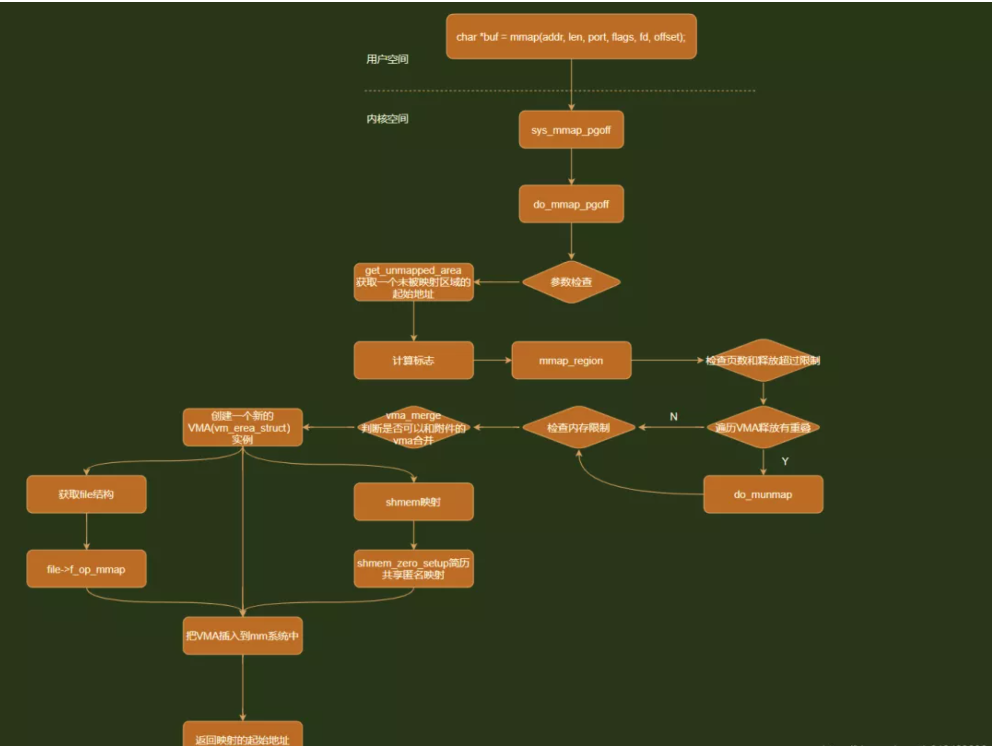 通过分析mmap的源码我们发现在调用 mmap() 的时候仅仅申请一个 vm_area_struct 来建立文件与虚拟内存的映射,并没有建立虚拟内存与物理内存的映射。假如没有设置 MAP_POPULATE 标志位,Linux并不在调用 mmap() 时就为进程分配物理内存空间,直到下次真正访问地址空间时发现数据不存在于物理内存空间时,触发 Page Fault 即缺页中断,Linux才会将缺失的Page换入内存空间。其代码流程图如下所示