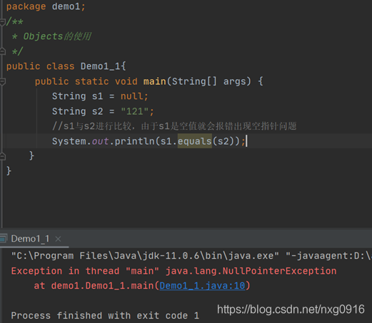 //s1与s2进行比较,由于s1是空值就会报错出现空指针问题