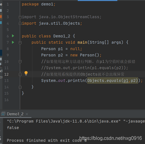 如果直接使用equals对两个对象s1和s2进行比较就会出现bug,比如s1是空值就会报错,控制台显示空指针异常