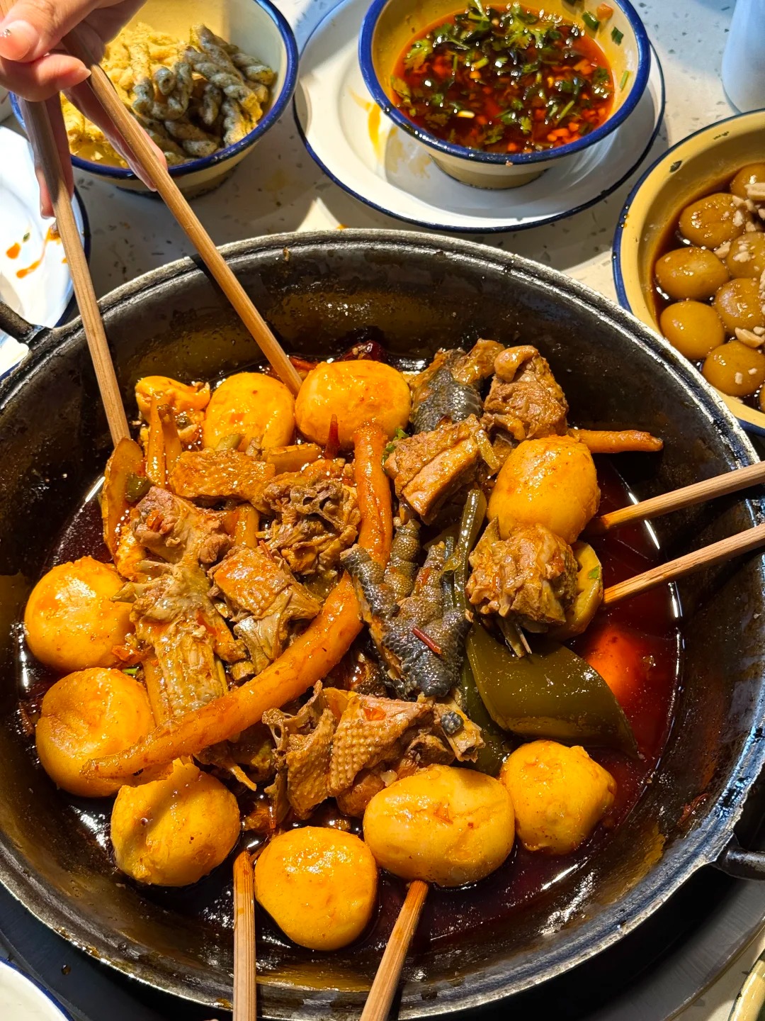 吃重庆江湖菜常见3个坑:一是辣度超标,吃完上火,二是食材不新鲜,靠调料掩盖,三是分量虚标,两个人点小锅都吃不完。而李子坝梁山鸡避开了这些雷区:首先,它用药膳+红汤工艺解决了燥辣问题,吃完不会口干舌燥;其次,李子坝梁山鸡坚持用定制跑山鸡,现点现焖,鸡肉紧实弹糯,能吃出食材本身的鲜味;后,它的分量设计精准适配场景,迷你锅1-2人、小锅3-4人,不会出现点多浪费的情况。比如回兴店的迷你锅,两个人吃刚好饱,性价比拉满。