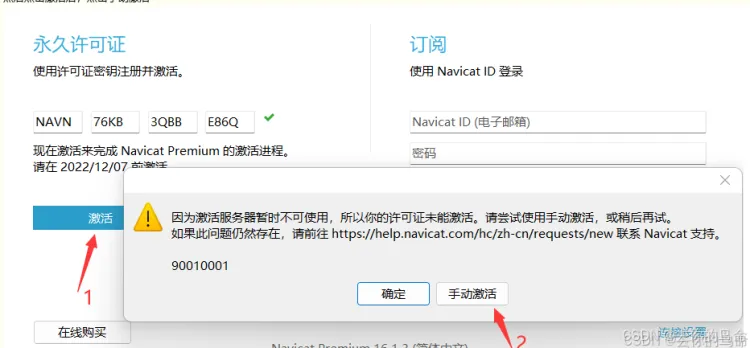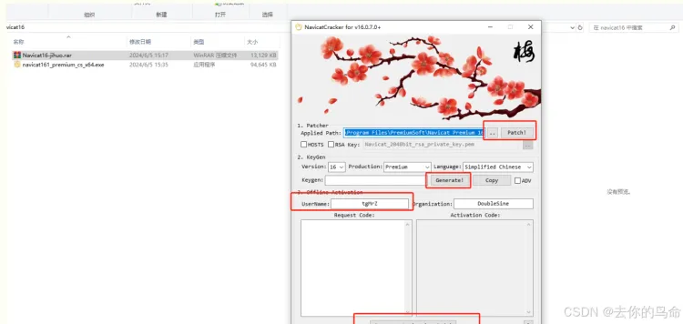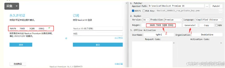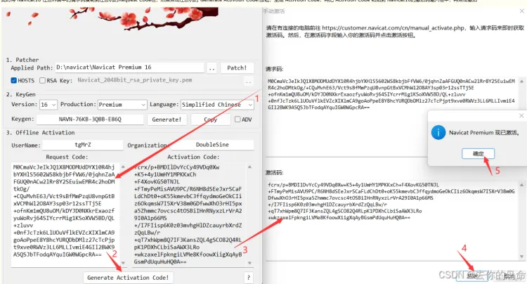 此时将 Navicat16 注册界面中的请求码复制到注册机的Request Code栏,然后点击注册机的 Generate Activtion Code!按钮,生成 Activtion Code;再把 Activtion Code 粘贴到 Navicat16的激活码输入框中,再点击激活