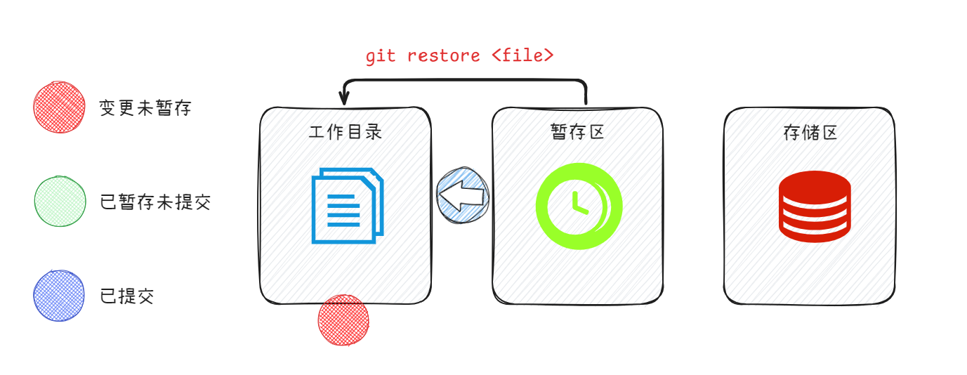git restore 将暂存区的快照覆盖到工作目录,完成更改的撤销动作。相当于 git add 的反向操作。