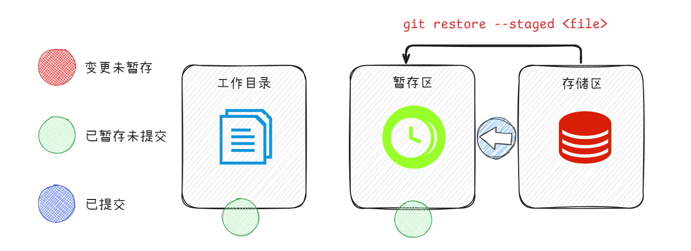 如果暂存区的状态与存储区不一样,使用 --staged 标志可以将存储区的快照覆盖到暂存区。覆盖完以后,暂存与存储区的状态变得一致,工作目录与暂存区的状态不再一致。相当于 git commit 的反向操作。