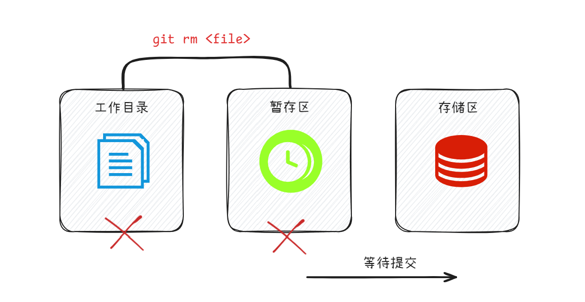git rm 命令会从工作目录和暂存区删除文件。此时,存储区的状态不受影响。此时如果想还原删除的文件,只能使用 git restore -stated file-name 命令。