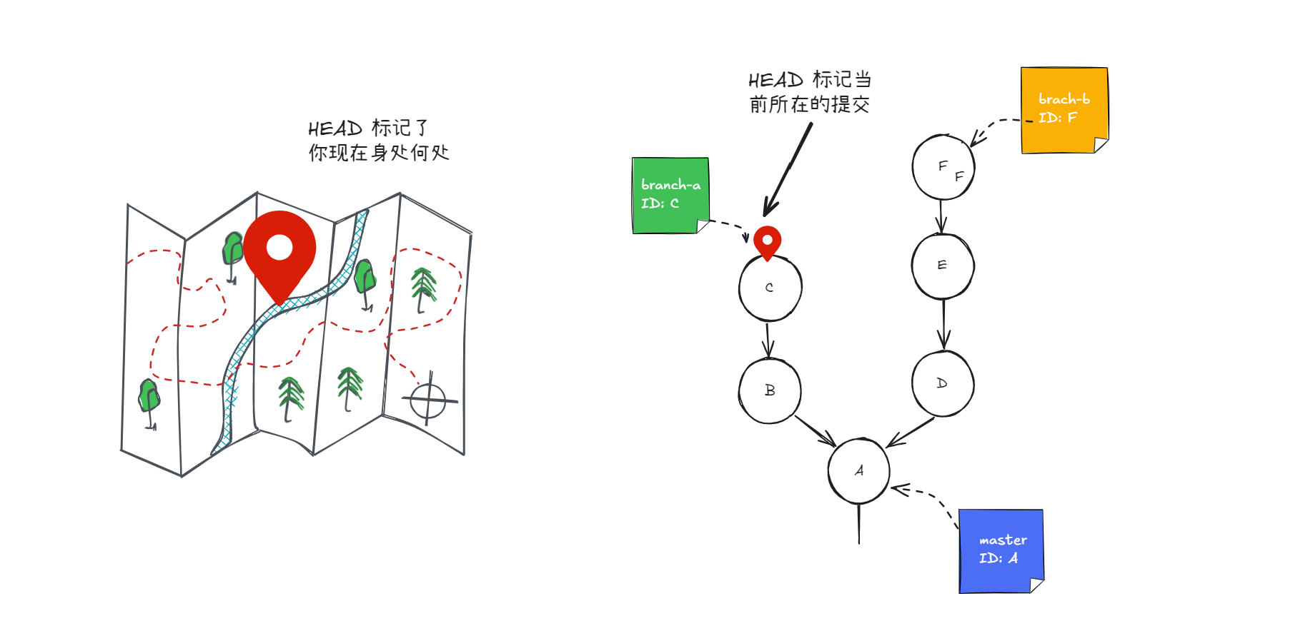 可以将 HEAD 想象成一个地图图标📍,在命令行中以*号表示。