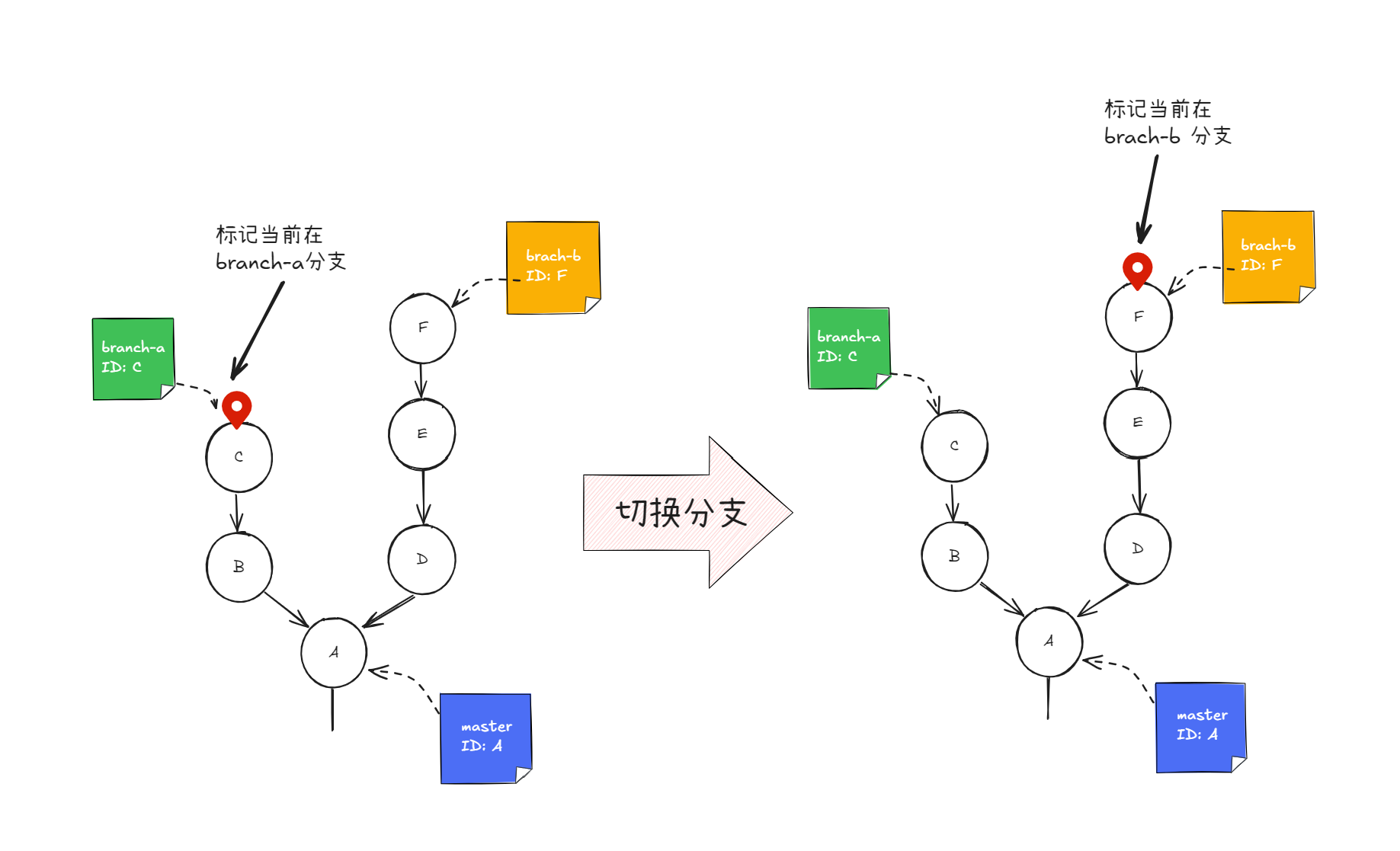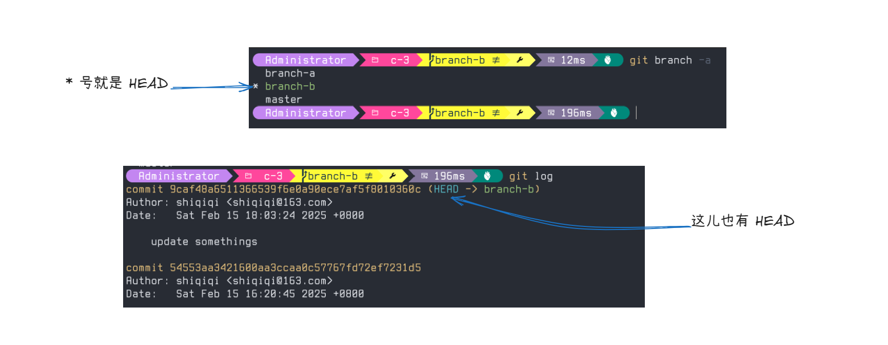 切换分支时,HEAD 会移动到目标分支上的最后一个提交。因为 HEAD 是指向提交的一个引用(这一点和分支很像),因此切换分支时,HEAD 与分支指向了同一个提交(默认是最后一个提交)。