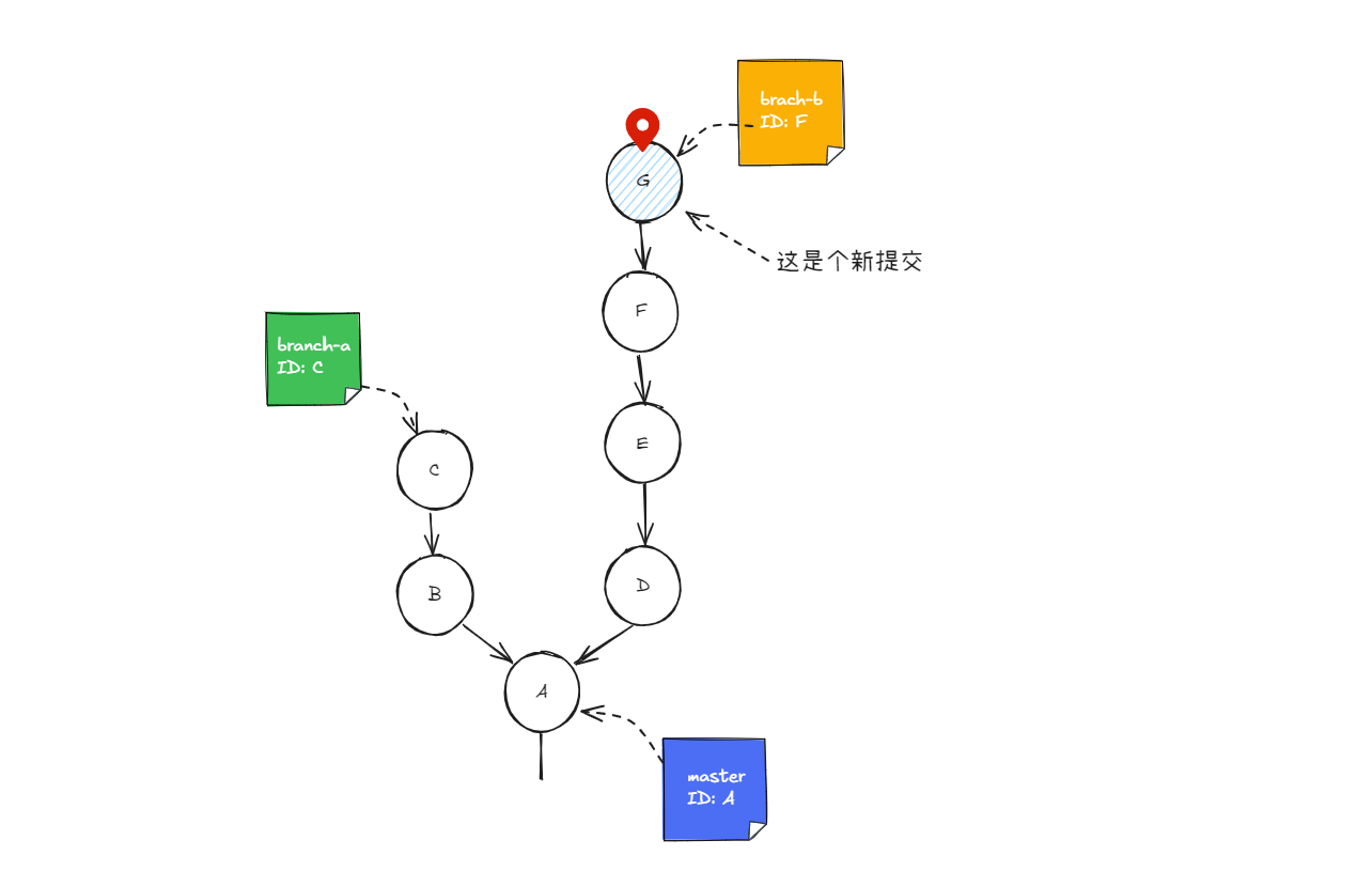 另外,符号 ^ 与 符号 ~ 可以结合使用。比如 HEAD^1 表示是的提交 C,那 HEAD^1~1 就是向上再找一级即 B 提交,以此类推。在分支 branch-b 上时,也是同样的道理。