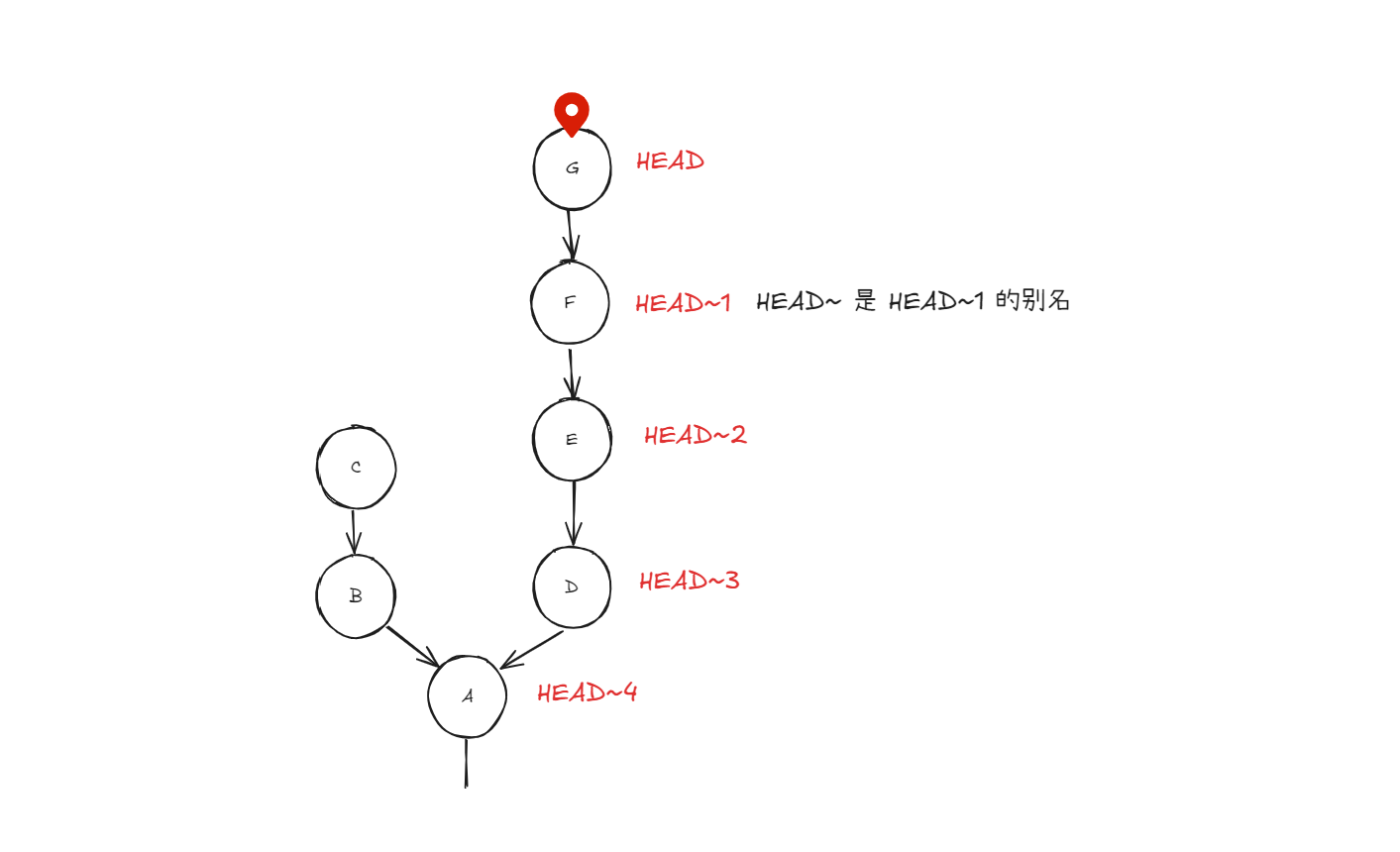 既然 HEAD 默认指向了分支上的最后一个提交,Git 就允许你使用 ~ + n 的形式来引用相对于 HEAD 的父级提交。