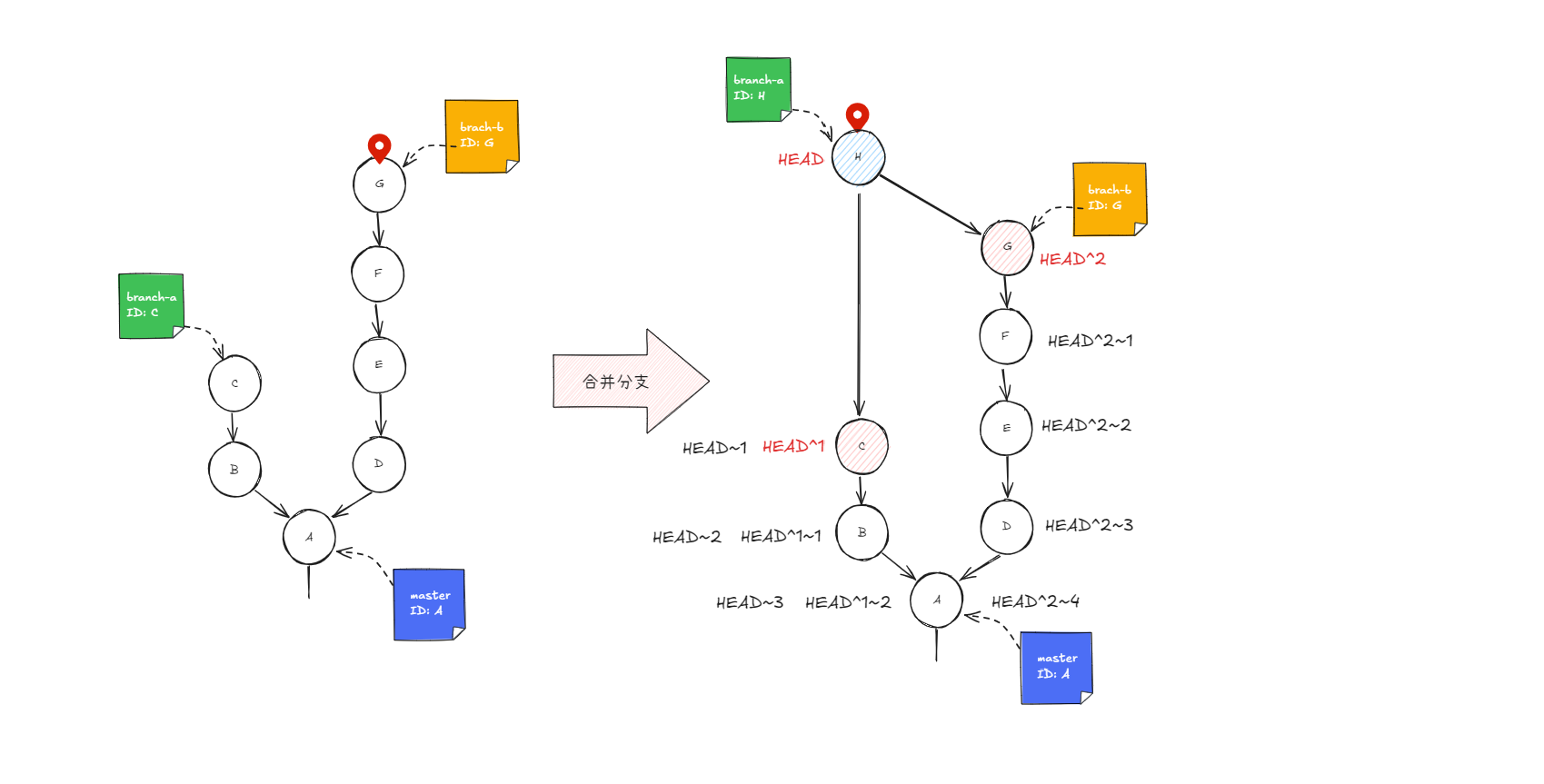 💡 提示:当HEAD处于合并提交上时,HEAD~n指向的就当前分支上的提交引用。所以HEAD~1 就是 HEAD^1。