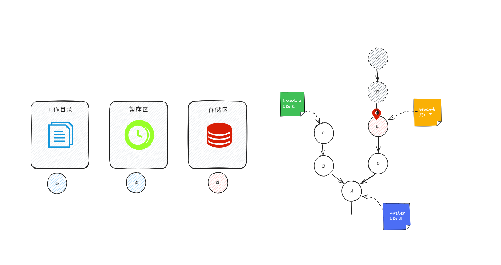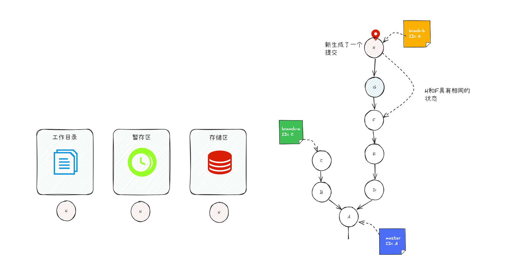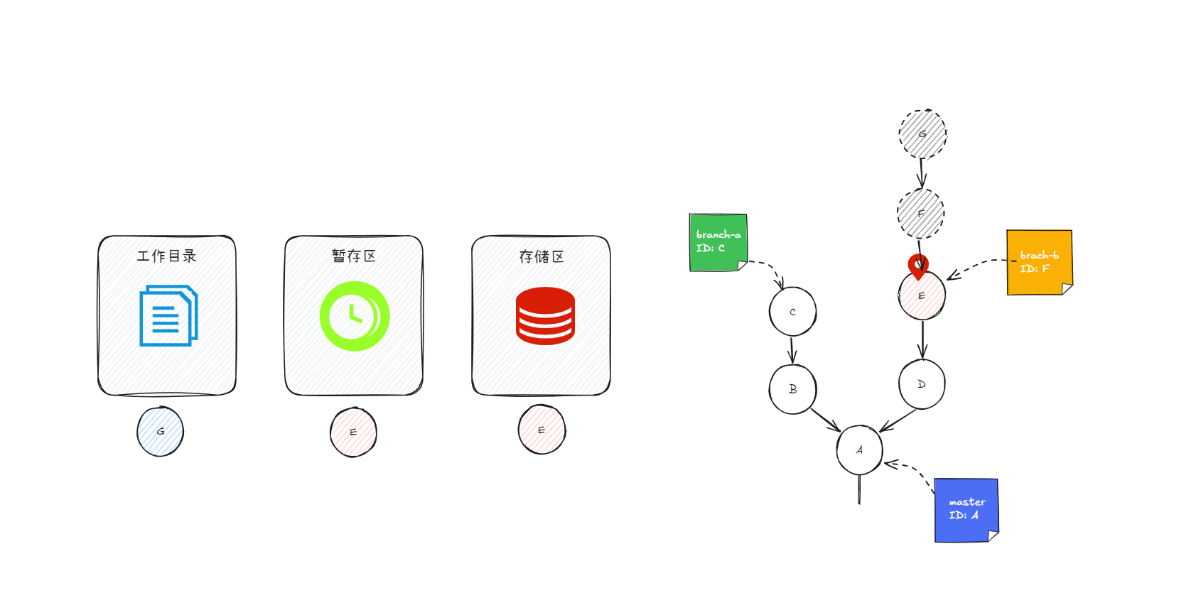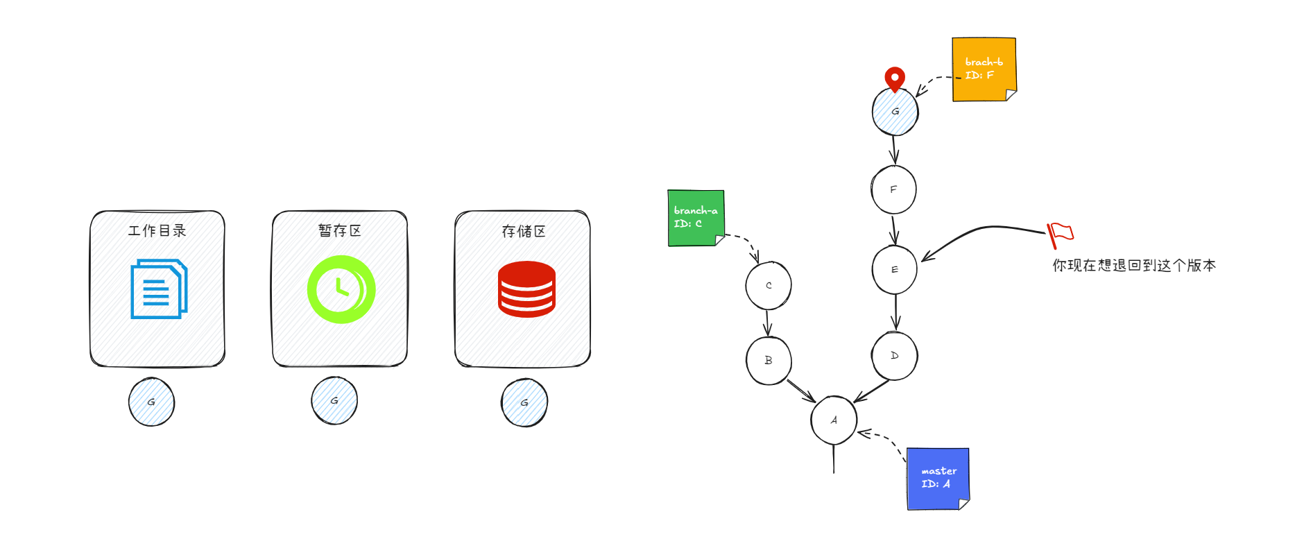 所有的提交都是不可变的,因此当从提交G撤销到提交E时,提交G和F并没有被删除。只是从提交记录历史上看不到了而已(因为如果有新提交,这两个提交没有子级,无法被追踪到而已),因此,如果记得这两个提交的ID的话,依旧可以将HEAD移动到这两个提交记录上来。